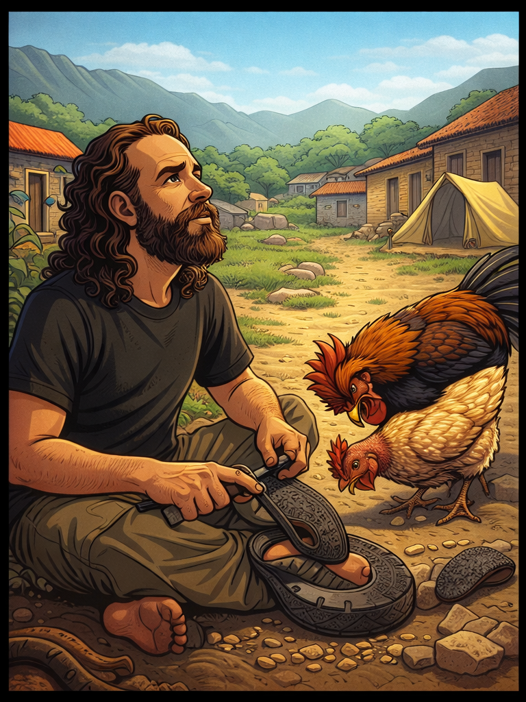 The year was 2008, Bolivia, in a village unknown. I was making sandals out of car tyres as I camped outside an abandoned hospital (long story).