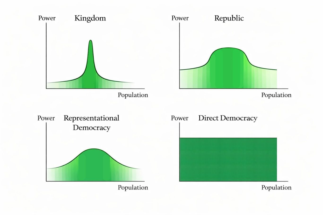 In a Kingdom, concentration of Power is held (mostly through violence and oppression) by the King and the few people around him who helped him control power. It is often riddled with power struggles as everyone vies for more power because the system is structured to self preserve and to prize Power above everything else, leading to chaos, or as Polybius liked to refer to it; Anacyclosis. (click here for an explainer video on Polybius's thesis on the cycles of governance which lead to revolution or chaos).